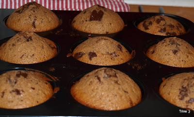 Jeg har gått til innkjøp av muffins-stekebrett til hytta, og satte i gang med å bake sjokolademuffins til kveldskosen foran peisen. Jeg er jo så heldig at jeg har en liten kjøkkenassistent på 15 måneder som hjelper til så godt han kan med å finne frem alskens boller og sleiver som det kan bli bruk for. Det er absolutt noe i ordtaket jo flere kokker jo mere søl og ikke minst rot!