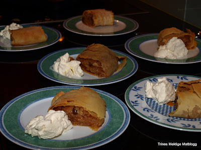 På siste gourmetkveld hadde vi Østerriksk aften. Menyen var satt sammen av Gourmetklubbens østerrikske representant, selvfølgelig. At hun valgte Apfelstrudel som dessert var ingen stor overraskelse, for vi har hørt om bestemors fantastiske Apfelstrudel siden tidlig på 90 tallet. Og vi hadde hørt hvor vanskelig det er å få til Apfelstrudelen helt perfekt. Desserten var helt klart kvelden største utfordring, og det var med litt skrekkblandet fryd vi gikk løs på oppgaven: