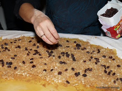 Nå drypper du det brune smeltete smøret over deigen, så fordeler du det stekte griljermelet (men ikke over hele deigen, la 2 håndbredder i lengden være fri for griljermel. Der du har griljermel skal du ha på hakkete epler, rosiner, valnøttene, litt sitronsaft, kanel og sukker (bedre for lite enn for mye sukker).