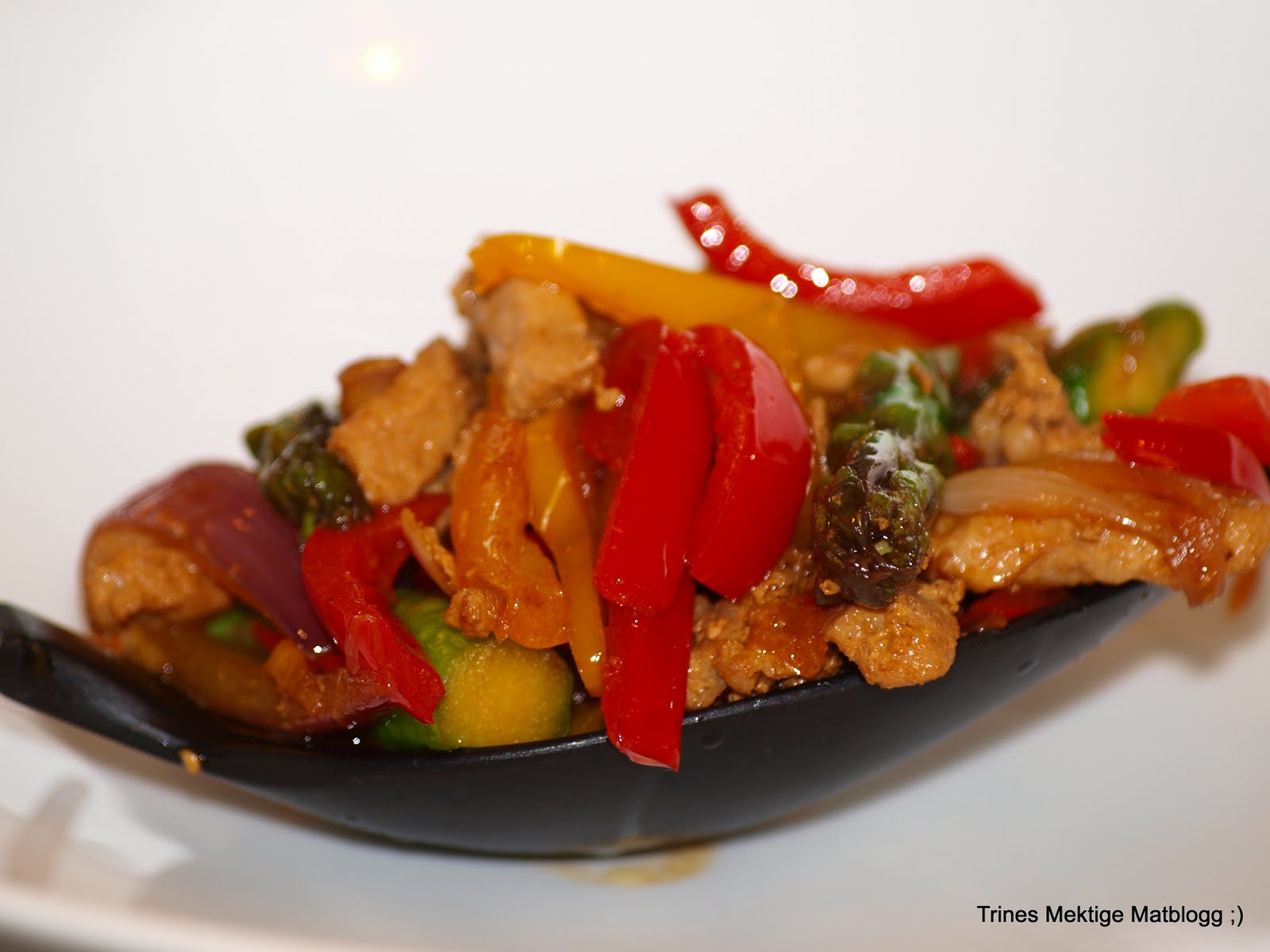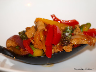2. Wow,det får man si; jeg hadde nesten samme ingrediensene i woken min i dag.Men vi hadde kylling i stedet for svin,samt at jeg brukte minimais istedenfor asparges.(tenkte ikke på at jeg kunne bruke asparges som jeg faktisk har liggende i kjøleskapet).Ellers må jeg nevne at vi hadde scampi på søndag etter din oppskrift…mmm,nydelig!!Hilsen Tine som nylig har oppdaget din gode matblogg…