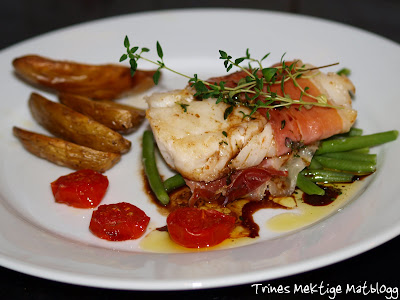 Serranosvøpt førjulstorsk med timianvinaigrette, bakte tomater og stekte mandelpoteter