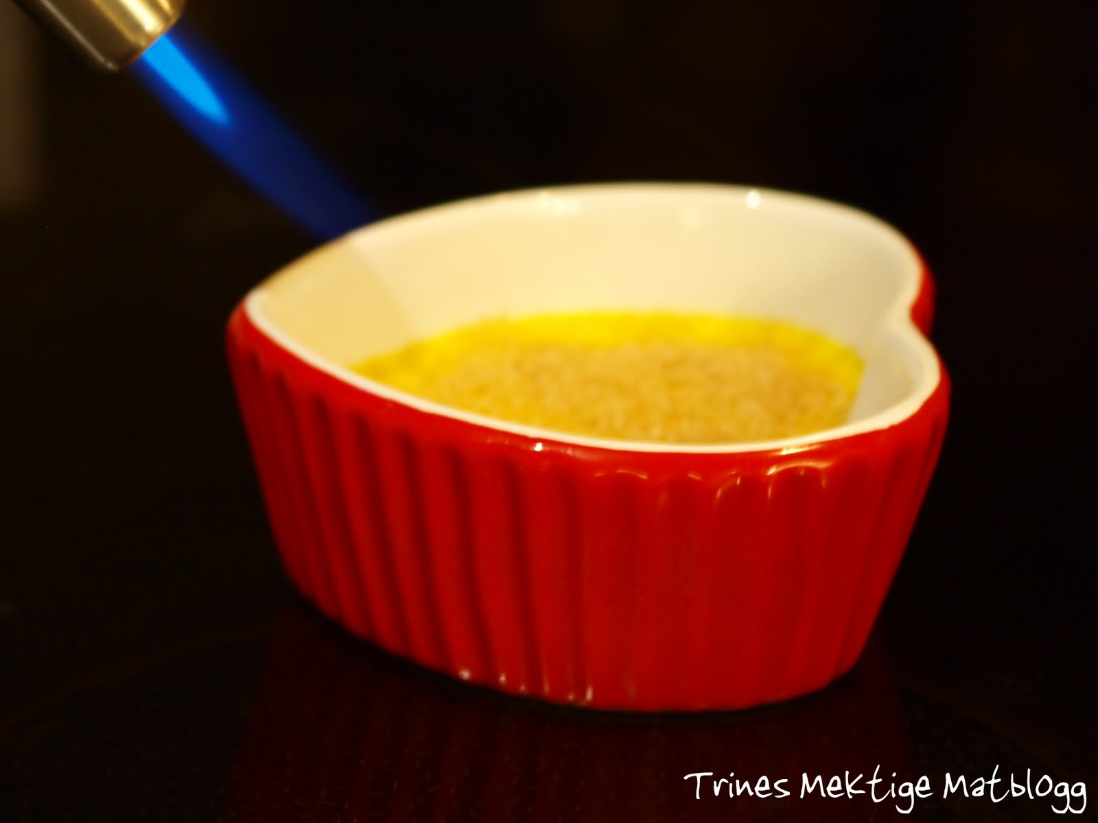 Rett før servering drysser du demerarasukker over og karamelliserer sukkeret. Dette kan gjøres på flere måter. Jeg har en creme brulee brenner som fungerer kjempefint. Utstyrsfreakene kjøper gjerne inn en skibrenner for formålet. Et annet alternativ er å bruke grillelementet i stekovnen. Når du setter inn formene må de sette de så høyt som mulig i ovnen og passe på at den er ordentlig varm før du begynner.