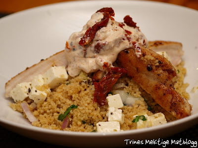 Anrett couscousen på en tallerken og legg kyllingfileten (som du har delt i to på langs) oppå. Ha på fetaost og legg tilslutt på en liten klatt med dressing.