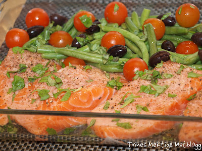 Ovnsbakt laks med brekkbønner, cherrytomater og sorte oliven