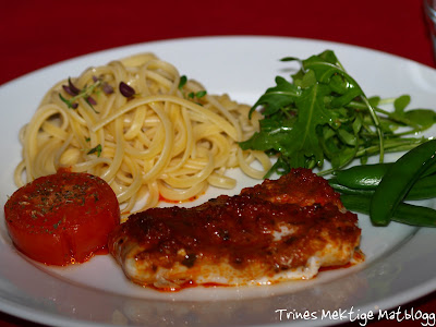 Serveres med det du ønsker til tilbehør. Mitt valg denne gangen falt på ovnsbakte tomater (stekt i samme form som fisken), ruccula, forvellede sukkererter og noen flak parmesan.