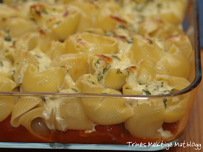 I mellomtiden kan jeg by på gratinerte pastaskjell med godt tilbehør. Jeg ble for en tid tilbake spurt av en av mine lesere om jeg har oppskrift på pastaskjell. Her er mulighetene mange, og her kommer en av de:
