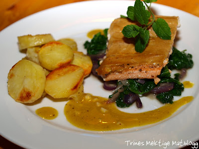 Anrett laksen oppå spinaten og server potetene og sennepssausen ved siden av.