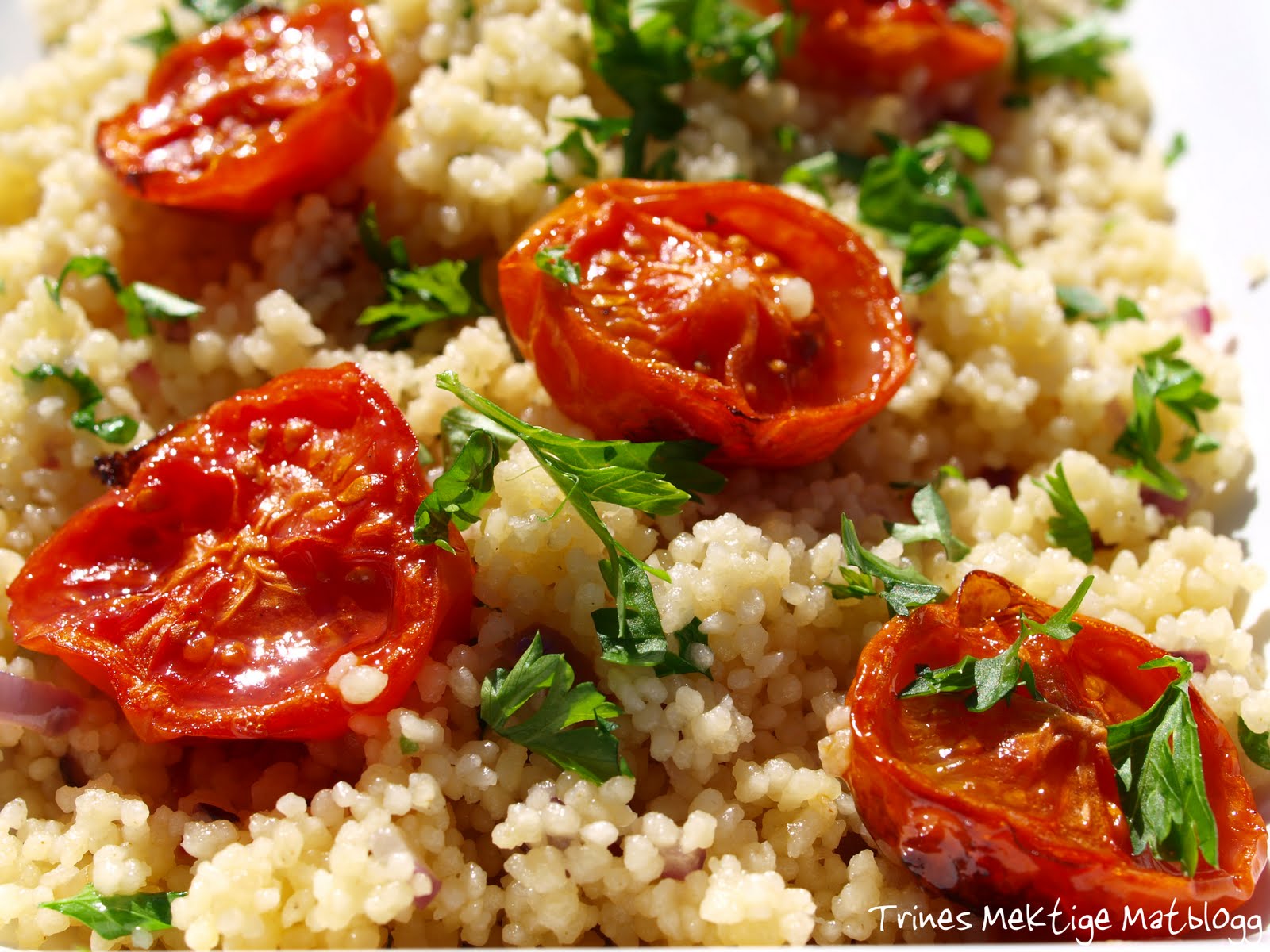 Couscous-salat med rødløk, sitron, urter og ovnsbakte tomater
