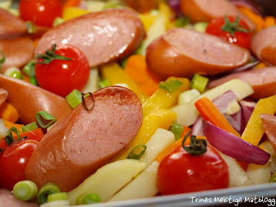 Stekes ved 225 grader i ca 15 minutter, eller til grønnsakene er passe møre og pølsene gjennomvarme.