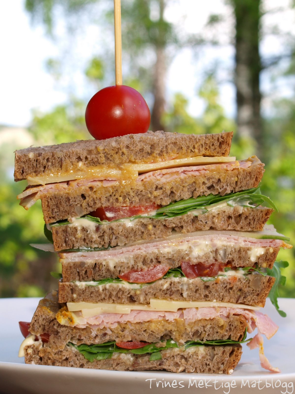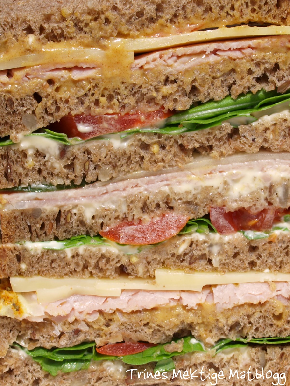 Bruk 2 til 3 brødskiver per person, alt etter størrelsen på skivene. Smør aioli (eller majones) på halvparten av skivene og sennep på den andre halvparten. Fordel kjøttpålegg (feks skinke, kylling eller kalkun), tomater, salat og ost (feks Jarlsberg eller cheddar) på skivene.