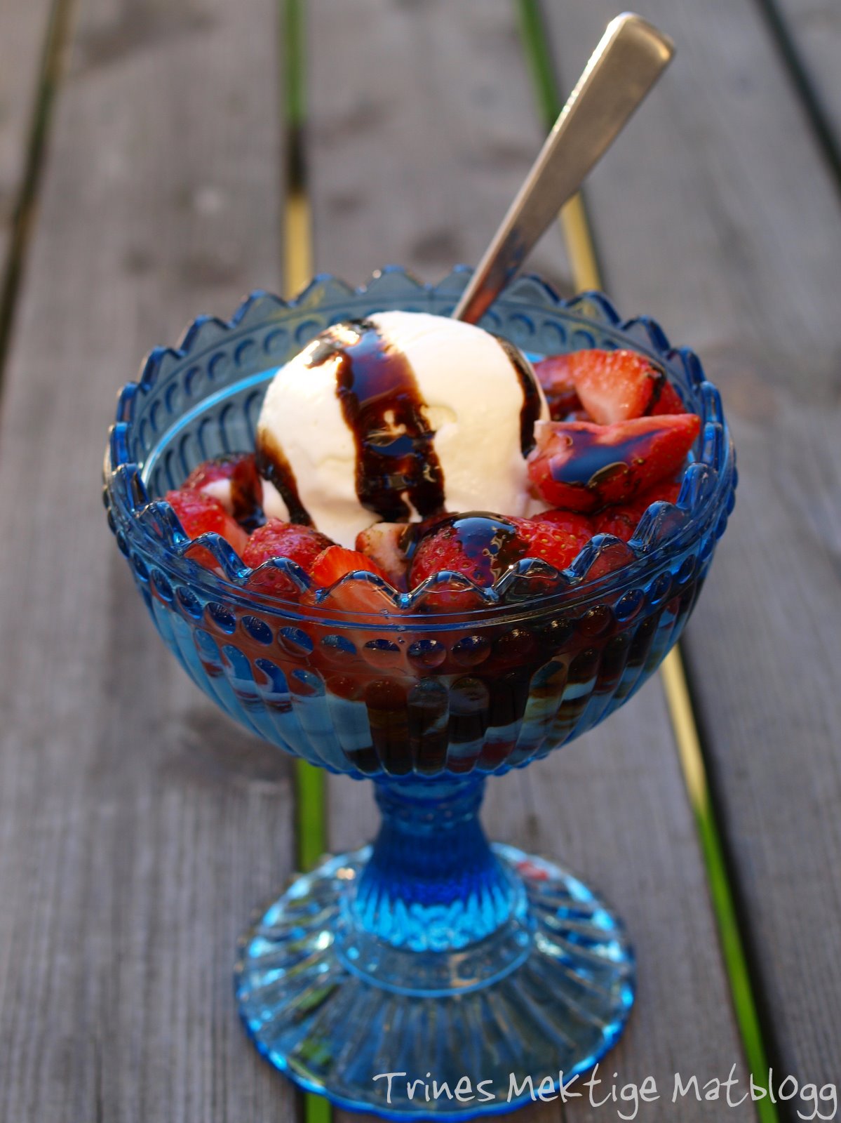 Balsamicosirup kan brukes til så mangt. Du kan lage den selv, eller kjøpe ferdig på flaske. Balsamicosirup kan for eksempel benyttes til salater, sauser, pasta, ost, til dekorasjon – og til jordbær og andre bær. Her serverer jeg lettsukrede jordbær med en kule god vaniljeis og et par runder med balsamicosirup over.