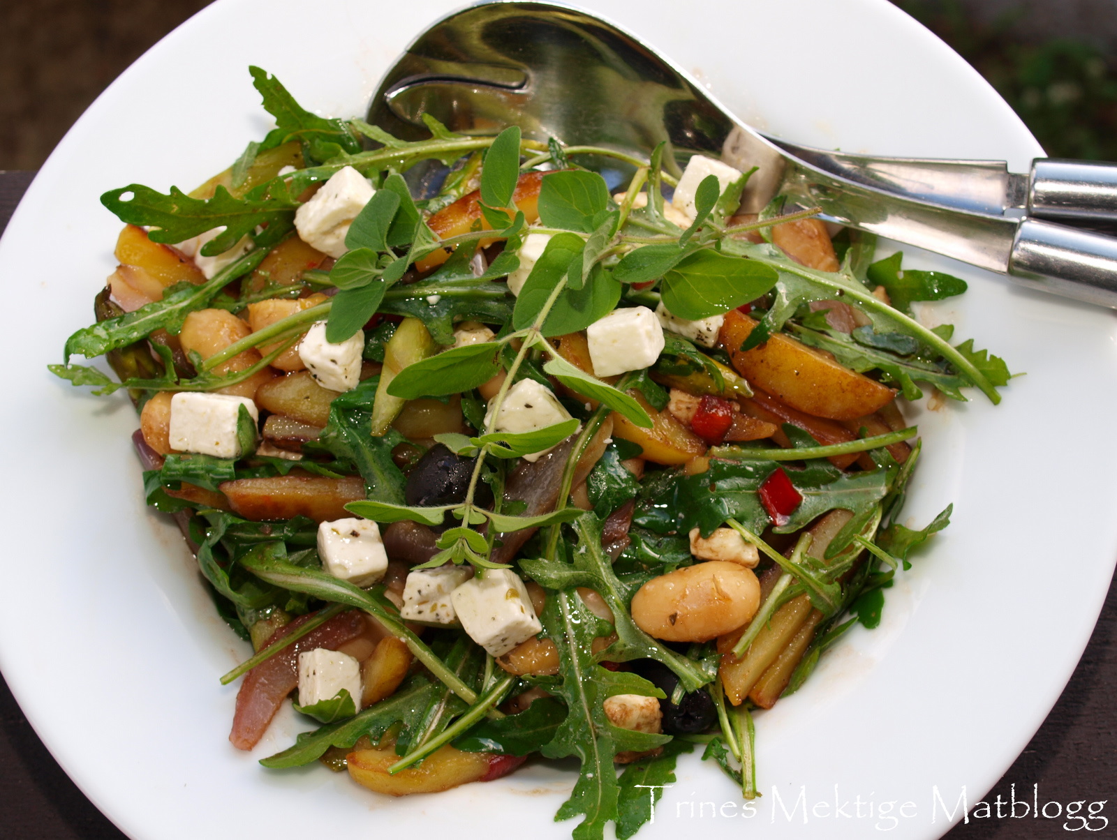 Fres potetstavene i litt smør til de er nesten ferdigstekte. Tilsett løk, og chili og la dette frese med. Tilsett deretter bønner og oliven og la dette bli varmt. Til slutt tilsetter du rucculasalaten og fetaosten. Ringle over litt olivenolje og balsamicoeddik, smak til med nykvernet sort pepper og eventuelt litt salt. Ha salaten over i en salatbolle og server.