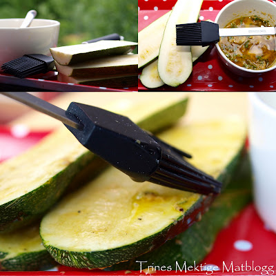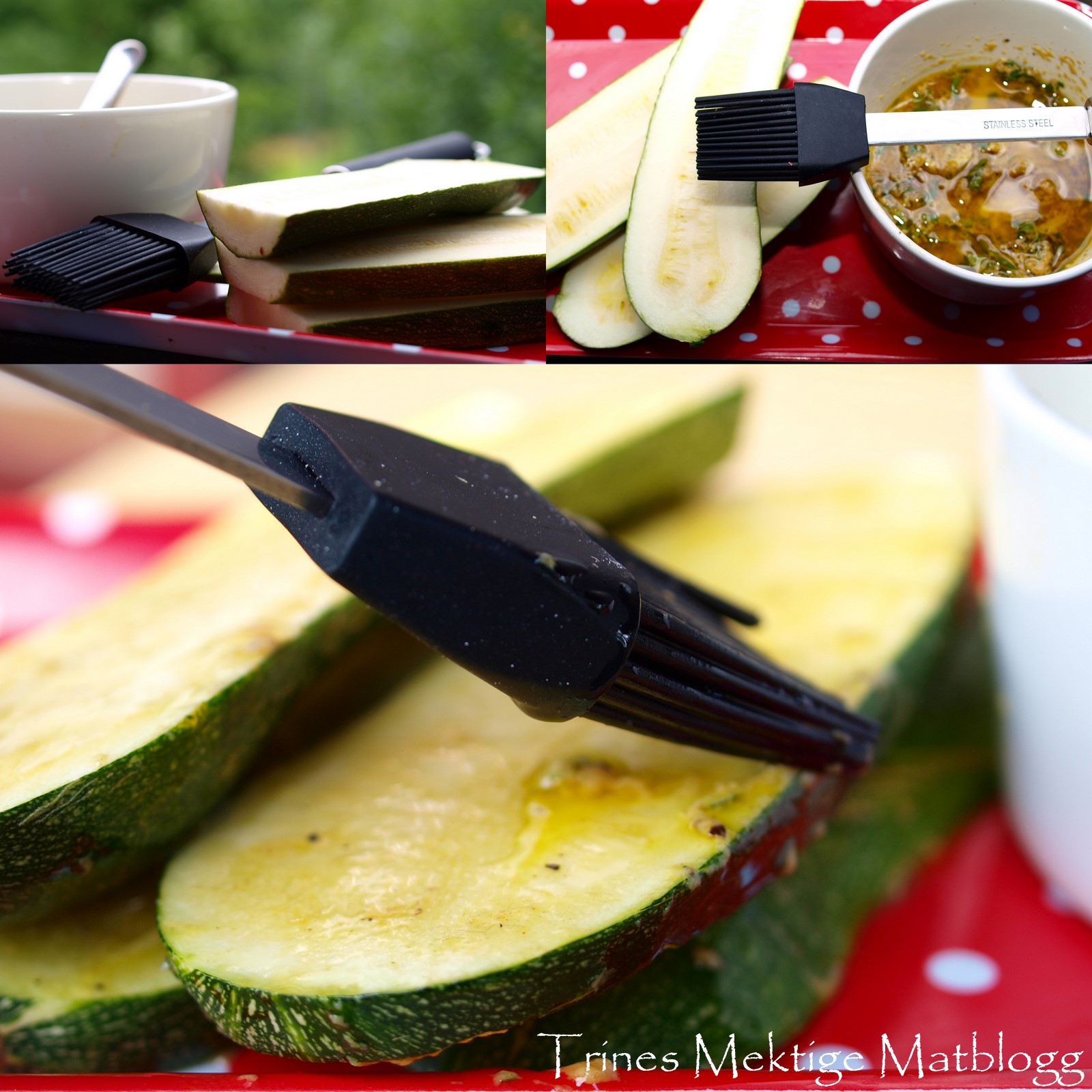 Bland sammen olivenolje, sennep og hvitløk, og smak til med salt og pepper. Pensle marinaden på begge sider av squashskivene. Grilles til squashen er mør og har fått fine «grillriller».