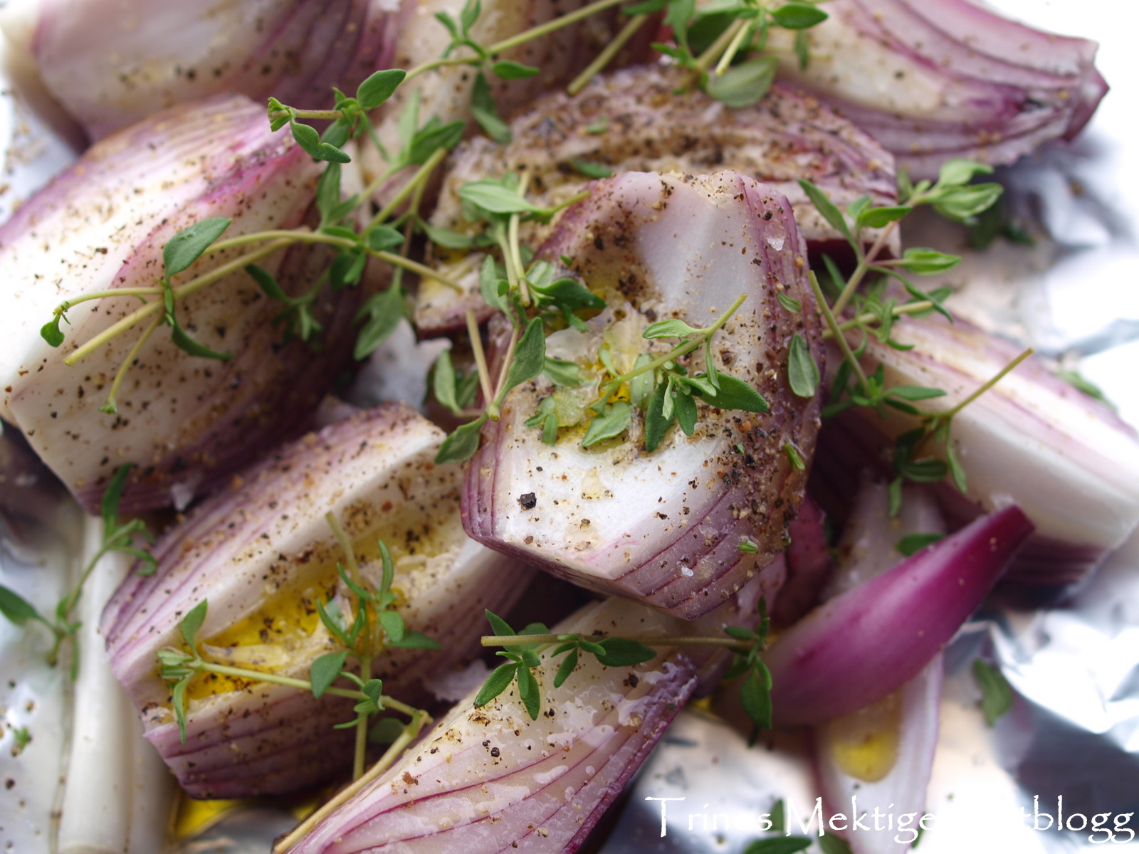 Ha rødløksbåtene og frisk timian (kan erstattes av andre friske eller tørkede krydderurter) i dobbel grillfolie og ringle over olivenolje. Ha på noen spiseskjeer presset sitron og krydre med bittelitt salt og pepper. Pakk folien tett og jevnt over løken og bak oppå grillen til løken er mør og fin.
