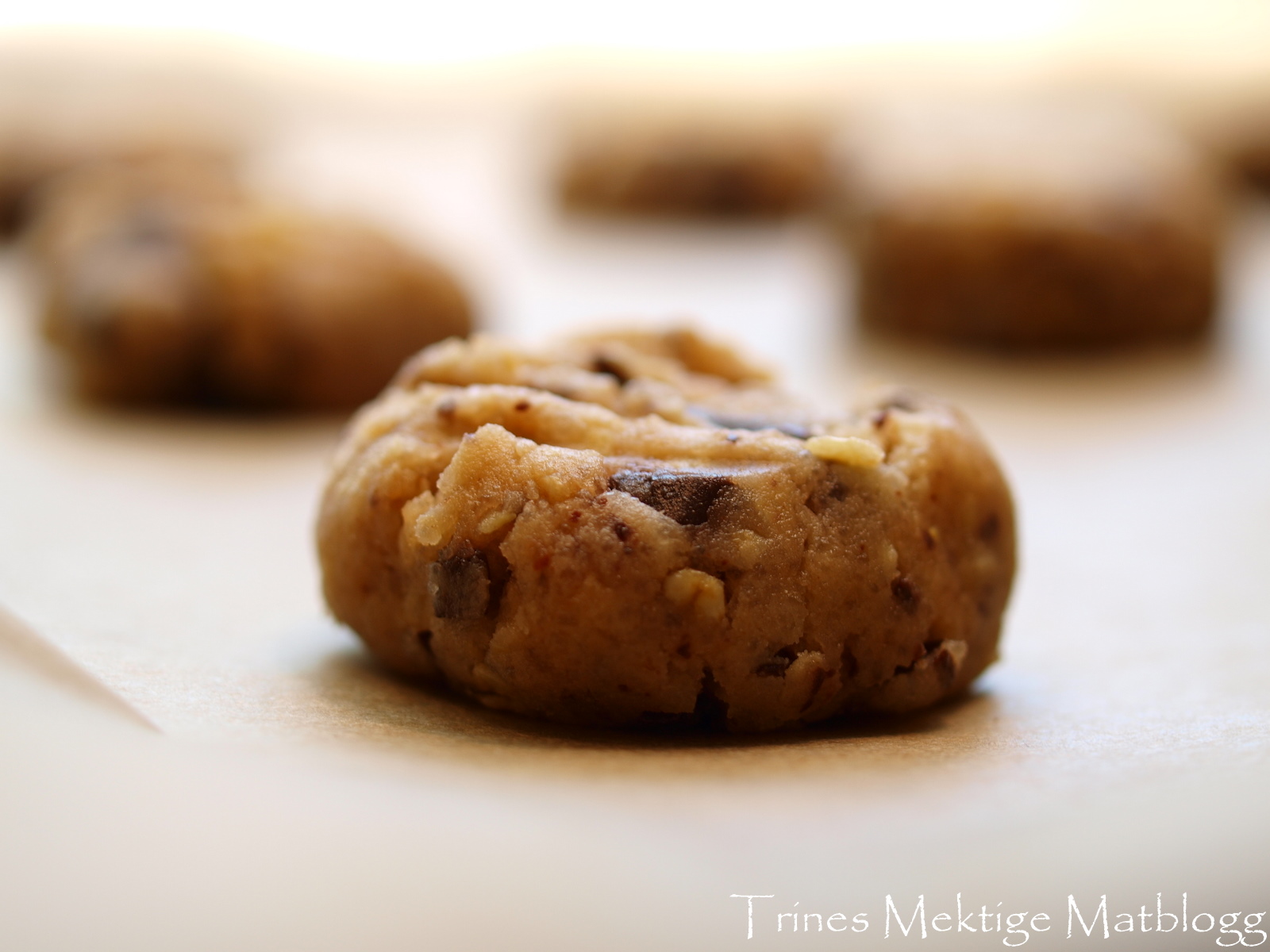 Rist havregrynene i stekepannen til de får litt farge. Hell over på en tallerken eller lignende slik at grynene blir avkjølt. Rør sukker og smør hvitt, og bland inn havregryn, bakepulver og hvetemel (hold igjen litt av melet). Tilsett deretter sjokoladen og rør forsiktig til sjokoladen er innarbeidet i deigen. Juster eventuelt med resten av melet.