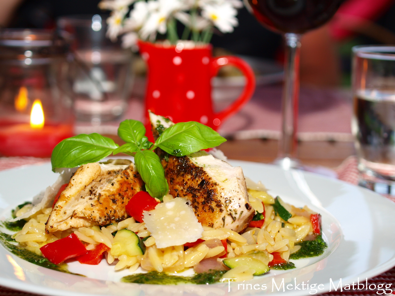 Dette er en rask, enkel og velsmakende kyllingvariant, med blant annet risoni som tilbehør. Risoni er pasta utkledt som ris, og fås i velassorterte dagligvareforretninger og «innvandrerbutikker». Kok den gjerne i litt buljong eller kraft så får du en ekstra god smak på risonien.