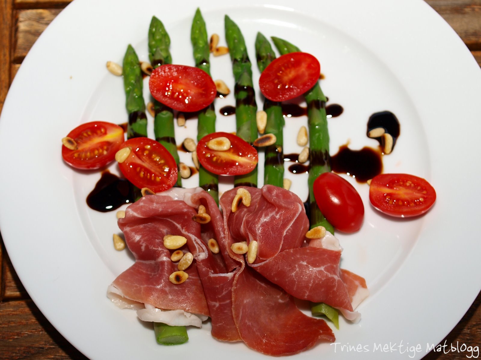 Asparges med parmaskinke, tomater, pinjekjerner og snøfriskkuler