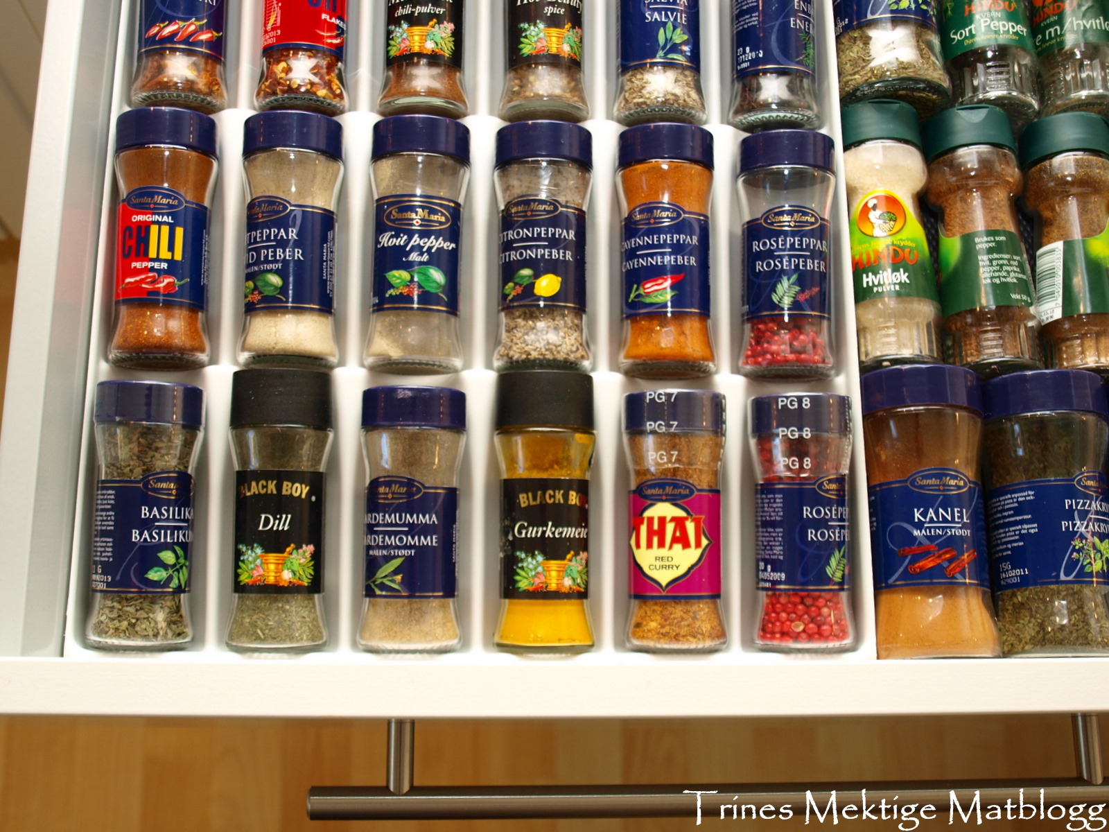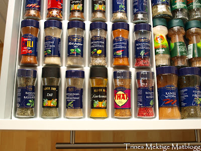 Under koketoppen lagrer vi tørrvarer, ulike kjøkkenredskaper, tallerkner – og ikke minst krydderet, som vi nå har full oversikt over!
