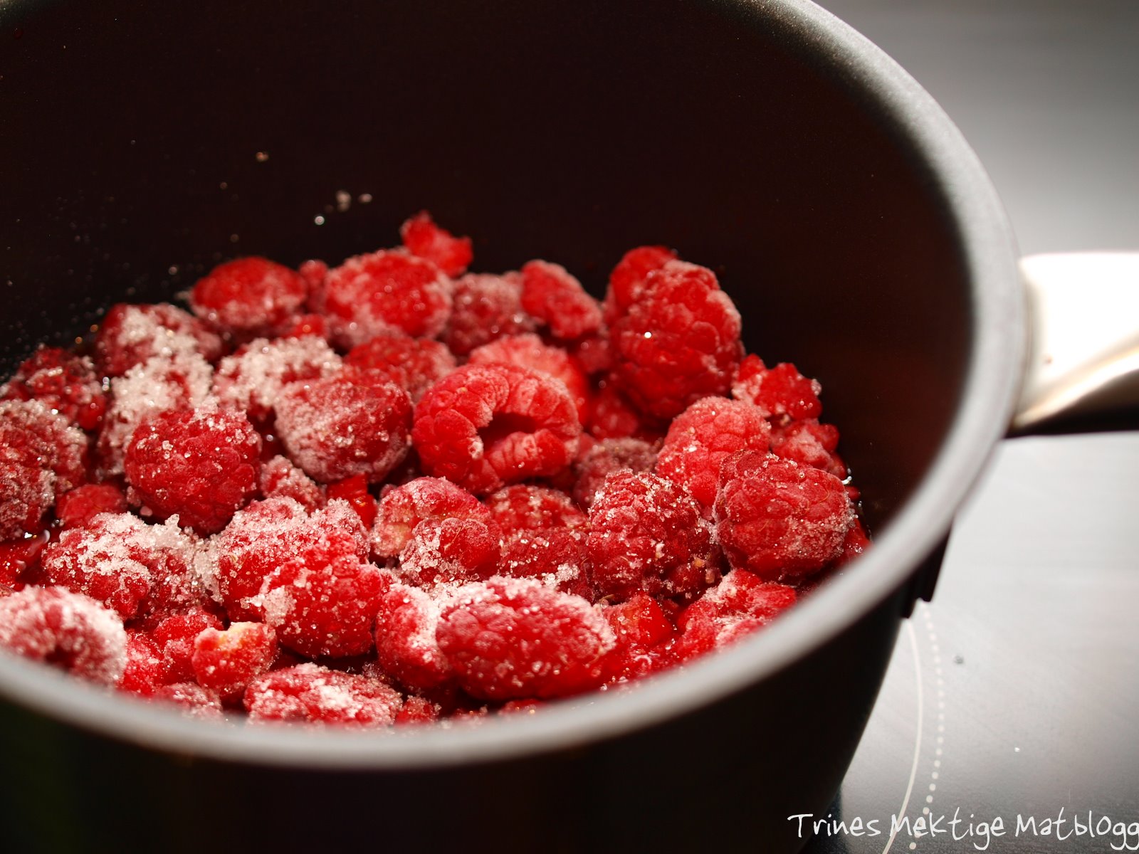 Begynn med bringebærsausen ved å ha bringebær og sukker i en kjele, og kok forsiktig opp.