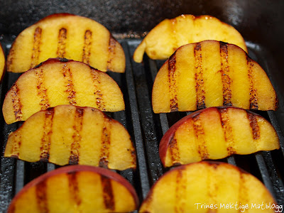 Rett før servering griller du ferskenbåtene til de blir møre og fine. Jeg brukte grillpanne, men grill de gjerne på utegrillen, eller stek de i litt smør i stekepannen hvis du ikke har grillmuligheter.