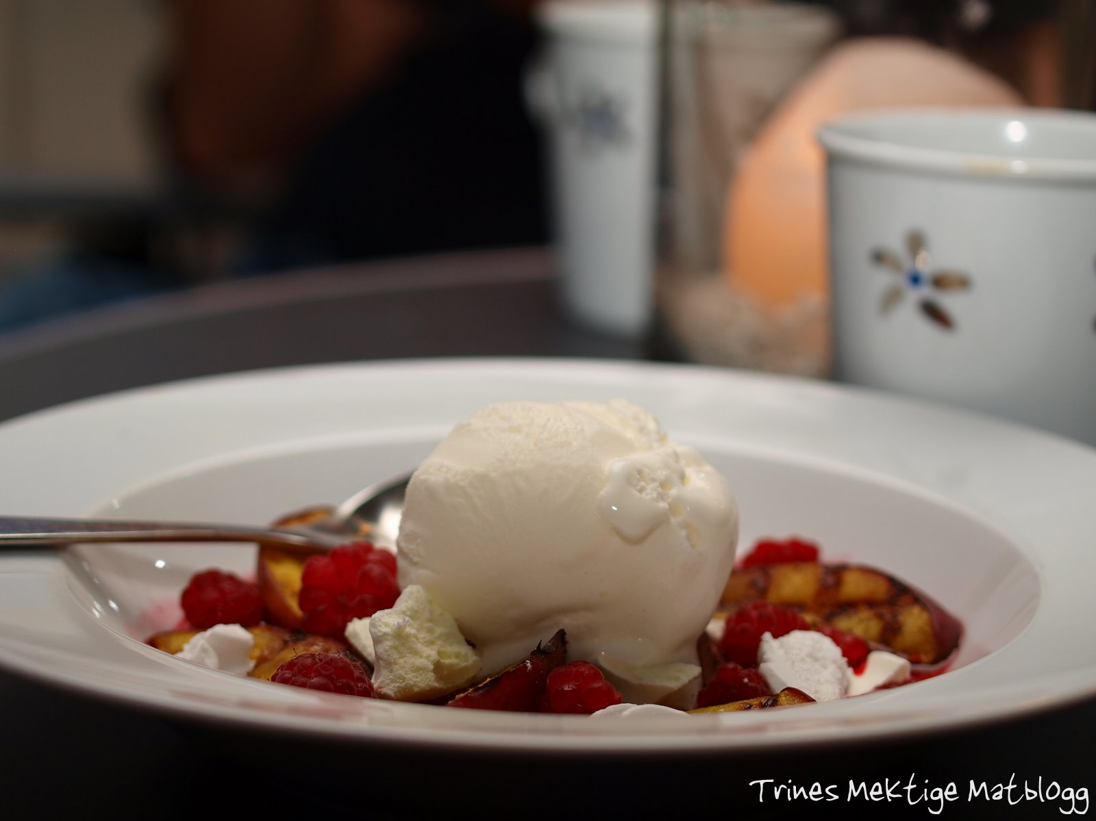 Grillet fersken med marengs, bringebærsaus og vaniljeis
