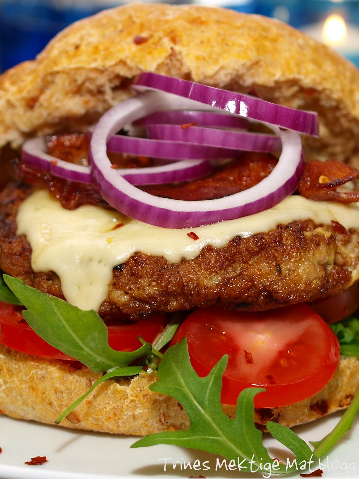 Kyllingburger med bacon, grovt tomatbrød og chilimajones