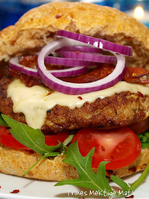 Hamburgerne er laget av kyllingkjøttdeig tilsatt litt finhakket bacon. Ønsker du å benytte kjøttdeig av storfe istedet, går det også veldig bra. Både hamburgerbrød og hamburgere er smaksatt med chiliflak (Red hot chiliflakes). Du kan eventuelt erstatte dette med frisk chili, eller droppe det helt.