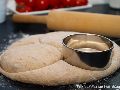 Begynn med hamburgerbrødene: Bland sammen melk, vann, olje, salt, sukker, grovbakst og mesteparten av hvetemelet. Ønsker du fine hamburgerbrød dropper du grovbakstmelet og tilsetter totalt ca 10 dl hvetemel. Kjør deigen i kjøkkenmaskinen i ca 10 minutter og juster deigen etterhvert med resten av hvetemelet. Mot slutten av eltetiden tilsetter du soltørkede tomater og noen chiliflak og kjør til dette er sånn noenlunde fordelt inni deigen. Dekk bakebollen med plast eller lokk og la deigen heve minst 40 minutter, gjerne til den får dobbel størrelse.