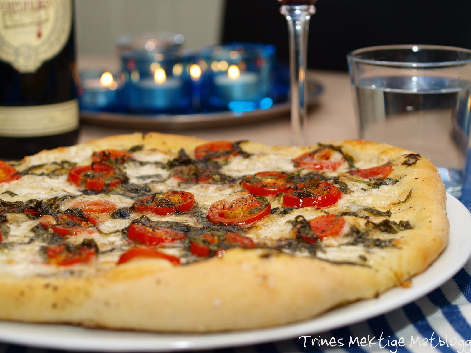 Fordel tomater, mozzarellaost og basilikum over deigen. Ringle over en god olivenolje og krydre med maldonsalt og nykvernet sort pepper. Stekes ved ca 275 grader i ca 10-12 minutter til pizzaen er ferdig stekt