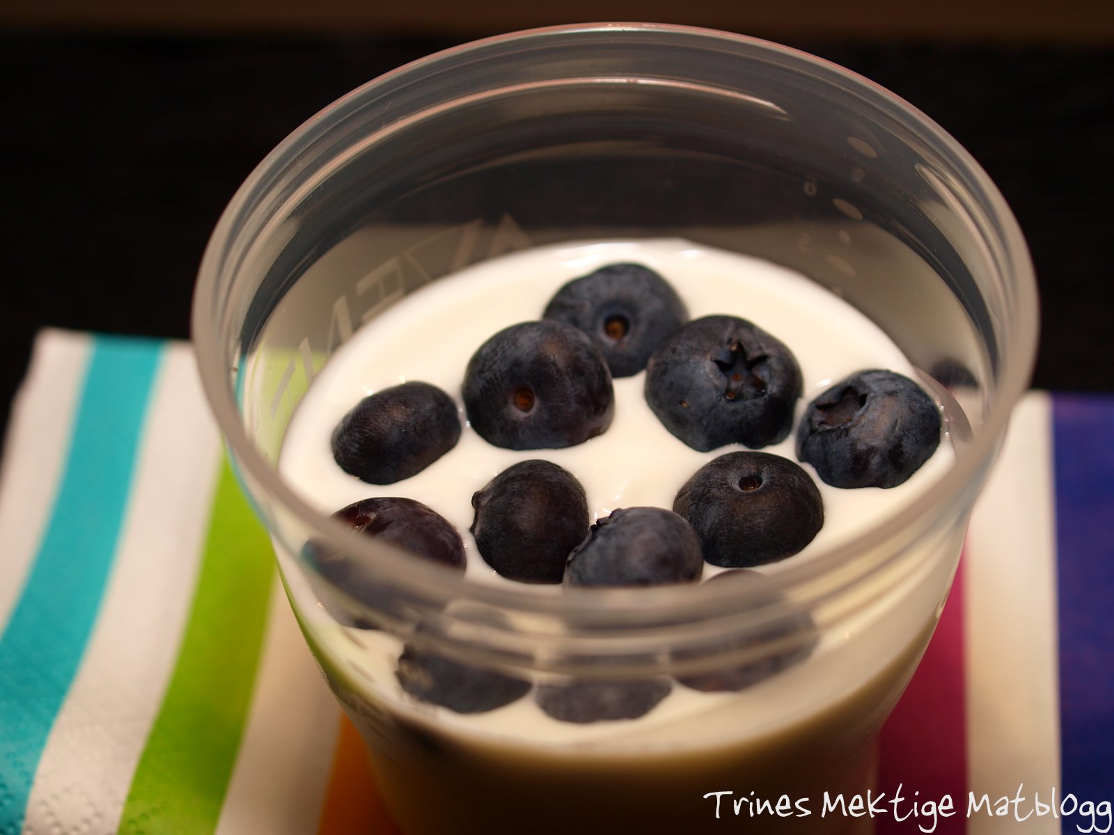 I matpakken puttet jeg også oppi et plastbeger med yoghurt naturell tilsatt friske blåbær. Her kan du benytte nesten alle slags frukt og bær. Bruk gjerne frosne bær oppi noen spiseskjeer yoghurt naturell eller kesam, så tar det ikke lang tid før bærene er opptint, og du har en sunn og god lunsj helt uten sukker!