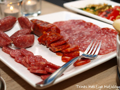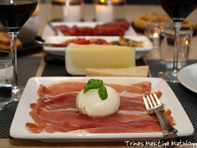 Sist fredag pakket vi frem herlighetene, supplerte med litt annet godt og anrettet de på fat, sammen med hjemmebakt brød (blant annet inspirert av denne italienske matbloggen) og grillede grønnsaker. Vårt antipastibord besto av følgende:
