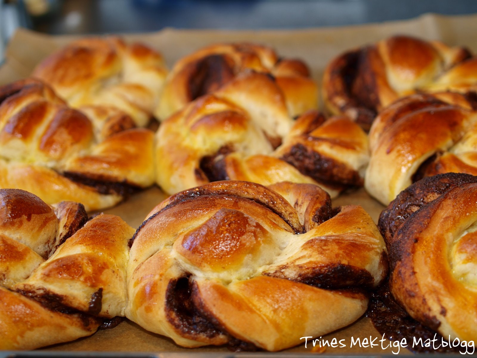 26. Trine, det var så moro ved en ren tilfeldighet å komme over den fristende matbloggen din, og ikke minst denne sjokoladebolleoppskriften! Jeg gleder meg allerede til eksamen er over og jeg skal bake disse til innflytningsfesten i desember :-)Jeg lurer bare på: rekker deigen til én eller flere deigrektangler? Ca hvor stor lager du rektangelen og hvor brede skjærer du strimlene?Takk for en flott inspirasjon!