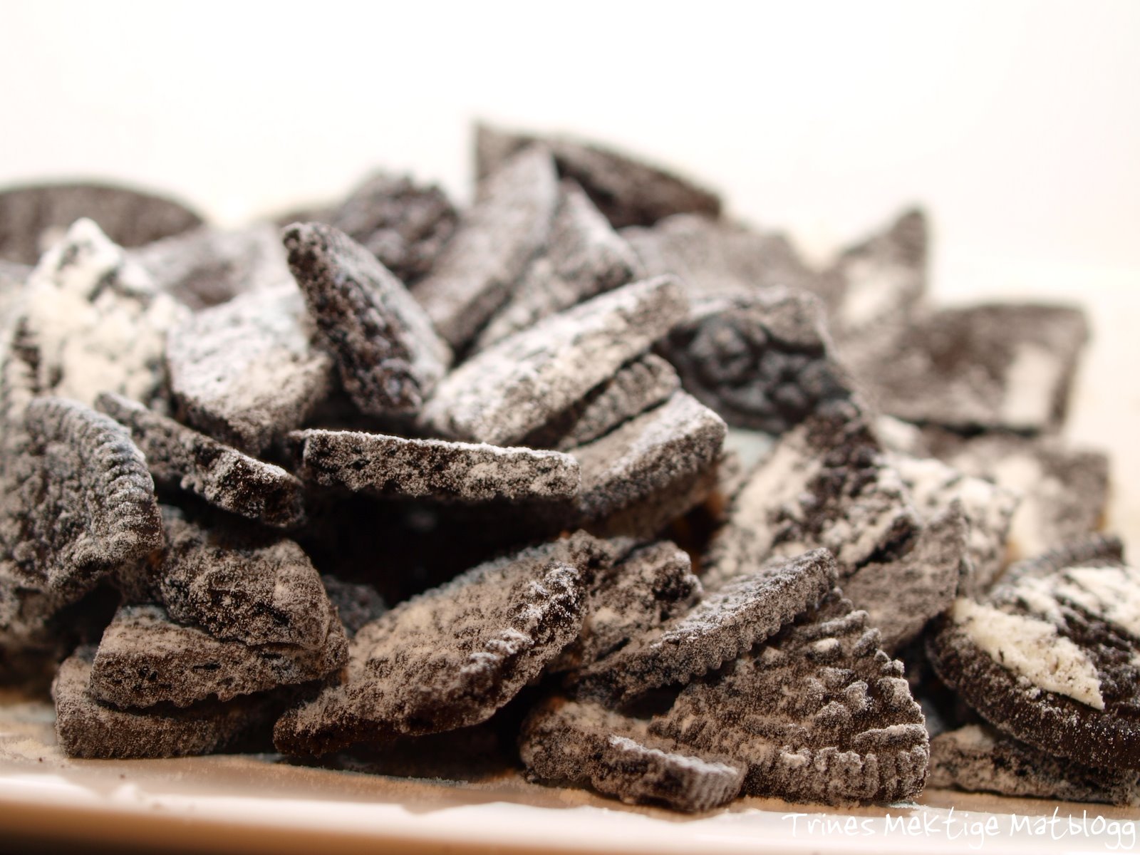 Laila; blandingen blir ikke helt jevn, mener jeg å huske, det er jo smør og melk… Vimsekoppen; etasjefatet er kjøpt på Ikea. Anonym; det skal benyttes store Oreokjeks (eller Dots). Du kan eventuelt benytte små Oreokjeks til pynt, slik jeg har gjort, men det er ikke nødvendig. Trine 😉
