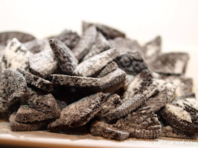 Pisk smøret luftig og kremaktig i en kjøkkenmaskin. Tilsett melk og frøene fra vaniljestangen og rør godt sammen. Tilsett deretter mel og bakepulver og kjør i ca 1 minutt, før du tilsetter sukker og kjører i 2 minutter, og deretter eggehvitene og kjører i ytterligere 2 minutter. Grovhakk 9 Oreokjeks, strø litt mel på, og vend de deretter forsiktig inn i muffinsrøra.