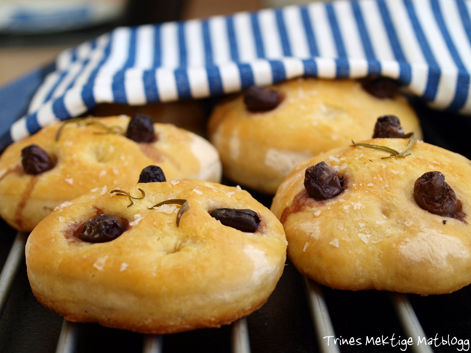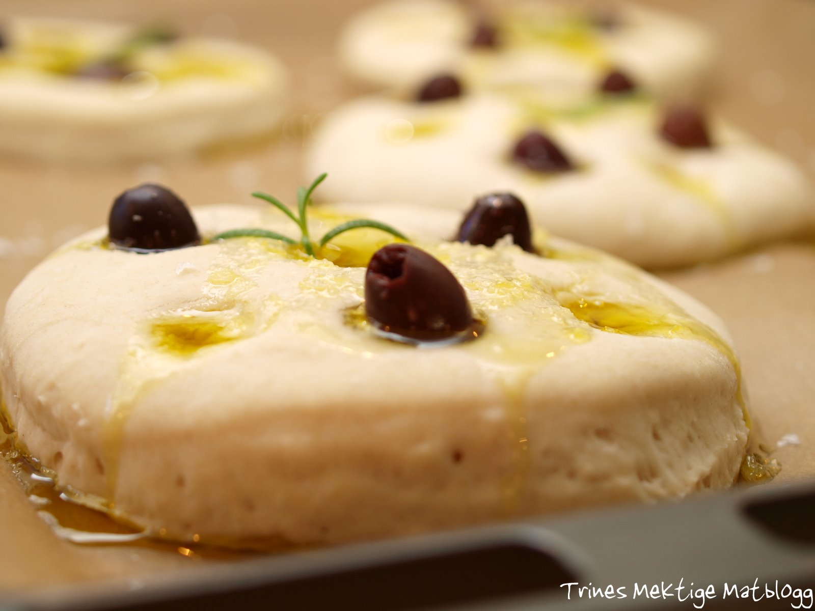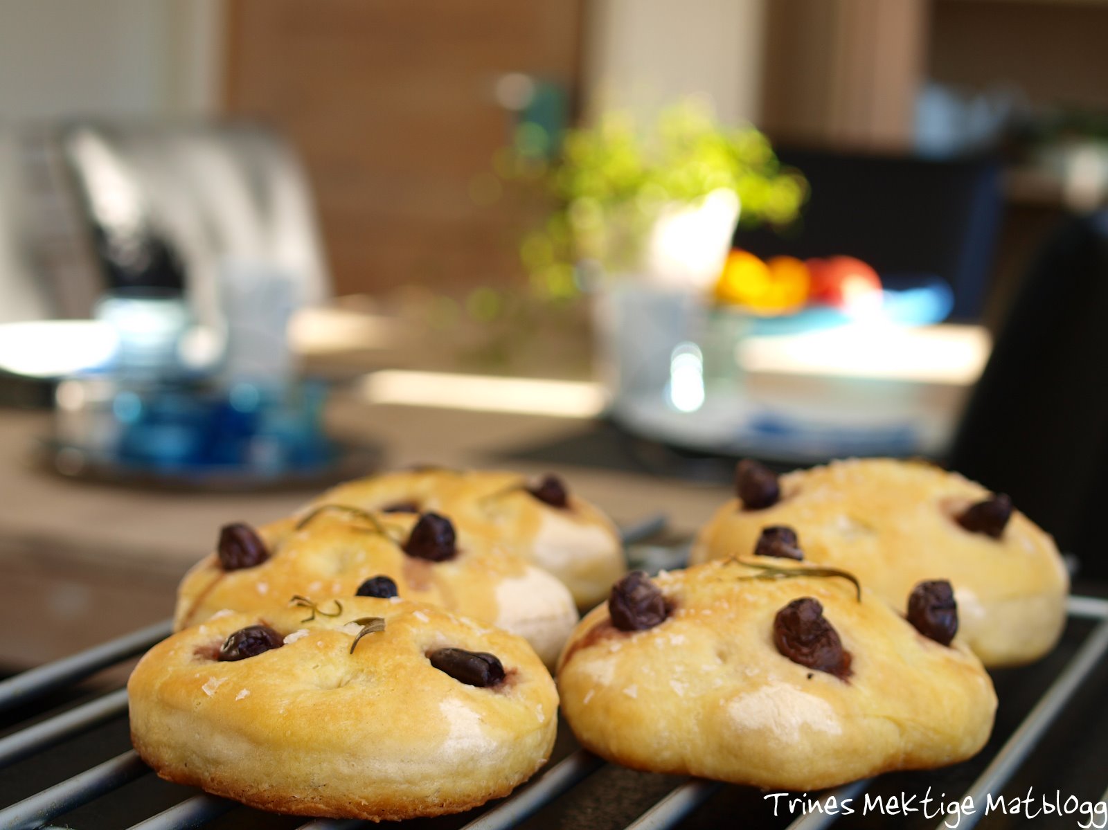La brødene etterheve i minst 45 minutter. Stikk nedi noen sorte oliven og noen kvaster frisk rosmarin, hvis du har. Ringle over en god olivenolje og strø litt malsonsalt over.