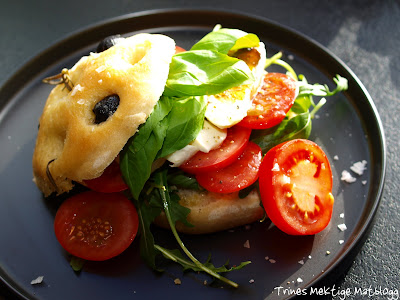 Journalisten fra Mat & Helse fikk servert minifoccacia med rucculasalat, tomater, mozzarella, basilikum, olivenolje og en god balsamicoeddik, samt et dryss med maldonsalt. En enkelt og litt sunn lunsj på en hektisk og begivenhetsrik fredags formiddag.