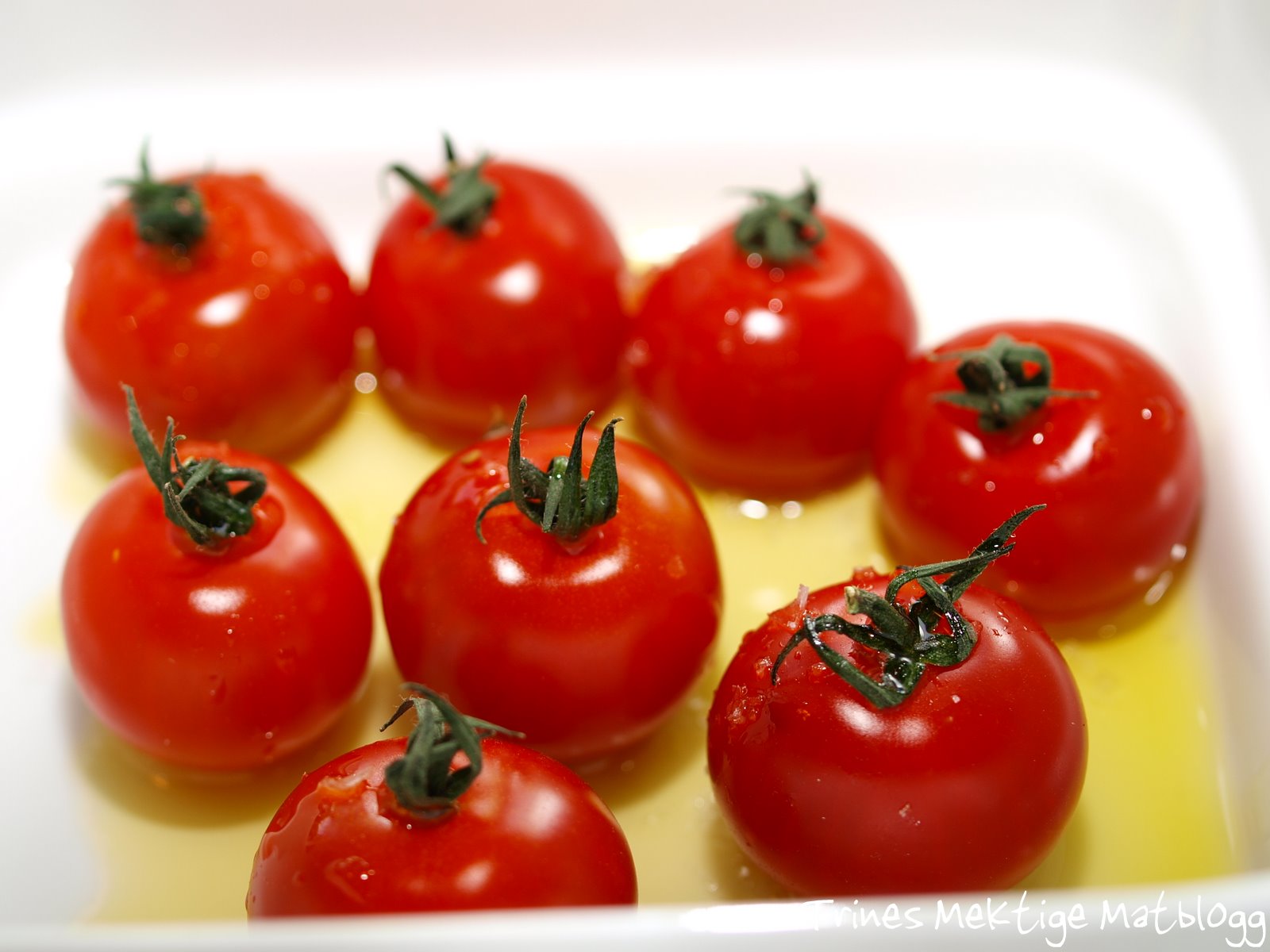 Tomatene: Sett ovnen på 180 grader. Legg tomatene i et lite ildfast fat, ringle over litt olivenolje og ha på litt maldonsalt. Sett de umiddelbart inn i ovnen mens du forbereder resten.