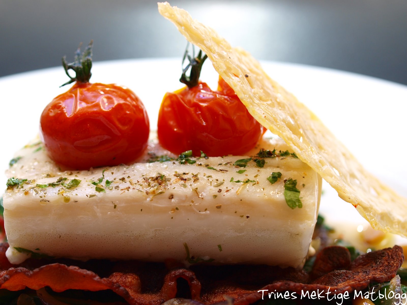 Anretning: Ha spinatsalaten på en tallerken, legg så en baconskive oppå og deretter fiskestykket. Plasser gjerne tomatene oppå fiskestykket og dander parmesanchipsen ved siden av. Server gjerne poteter, ris eller pasta som tilbehør, og ringle gjerne en god balsamicoeddik over spinatsalaten ved servering.
