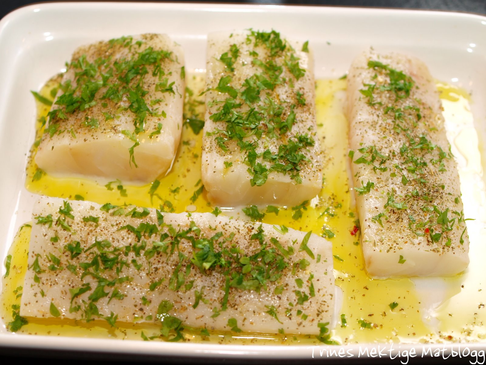 Torsken: Legg fiskefiletene på et smurt ildfast fat. Ha over litt olivenolje og litt sitronsaft. Krydre med salt, nykvernet sort pepper og finhakket persille. Sett ovnen opp til 200 grader og stek fisken i ca 12-15 minutter, til den er passe stekt og såvidt faller fra hverandre.