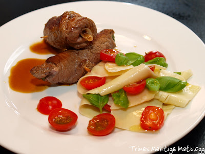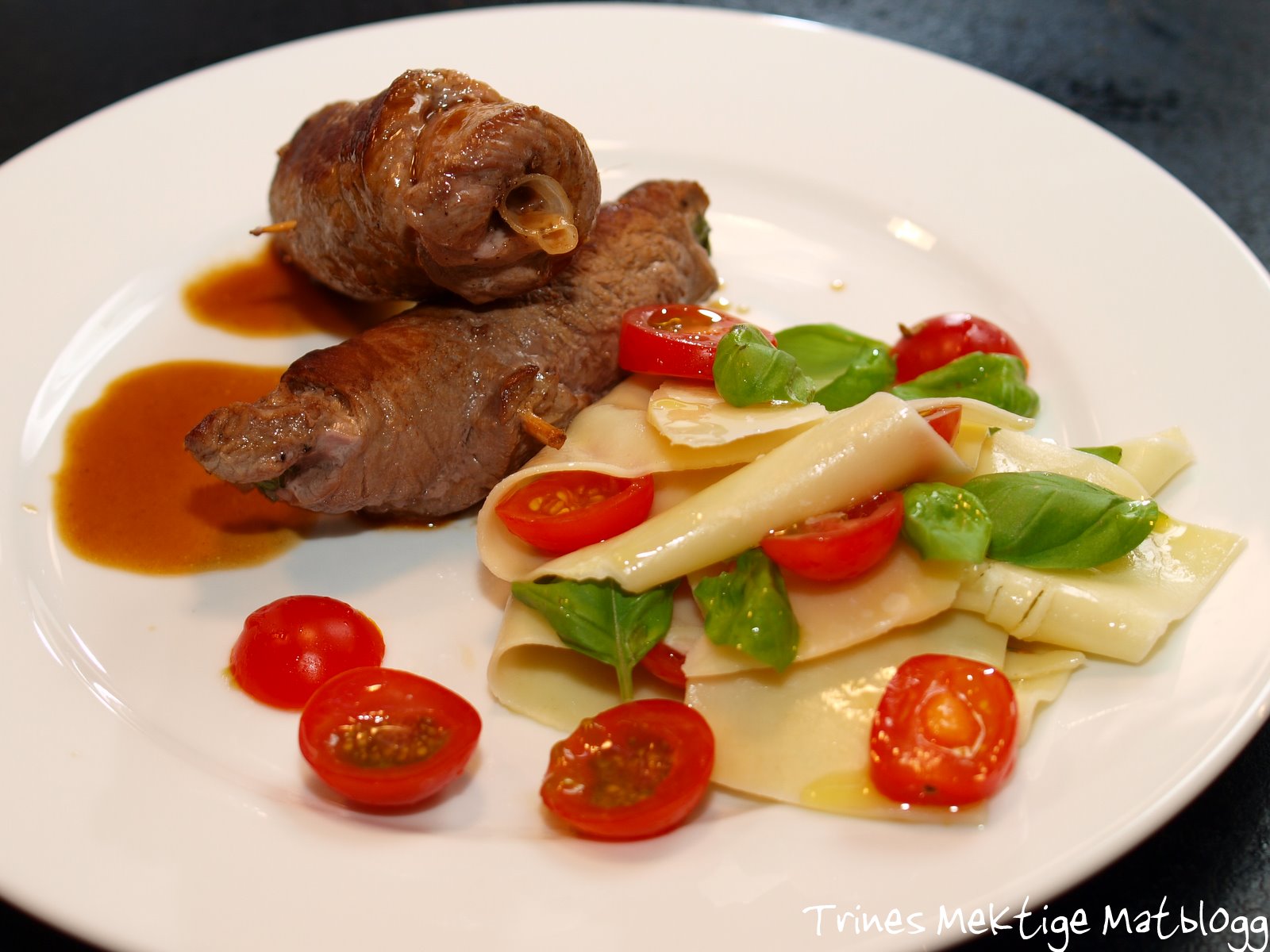 Ha på nykvernet sort pepper, salvieblader (eller basilikum) og en skive parmaskinke. Rull sammen og fest en tannstikker (uten smak) i skjøten.