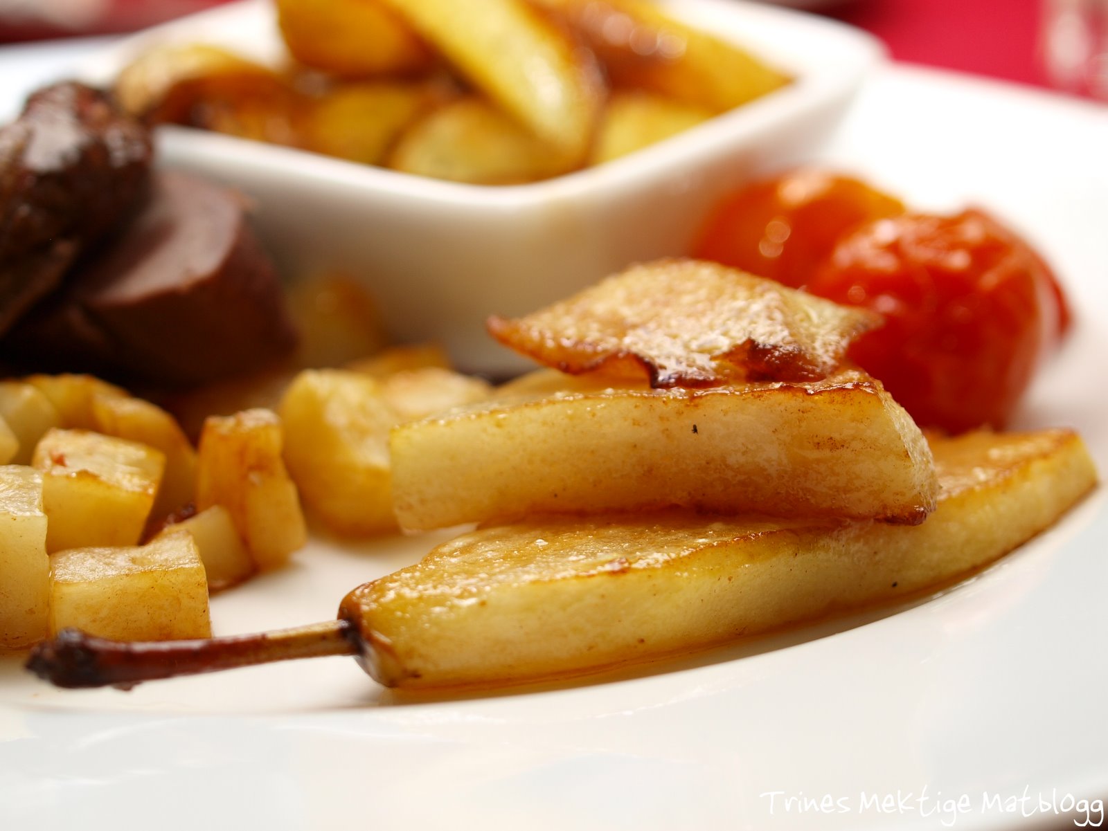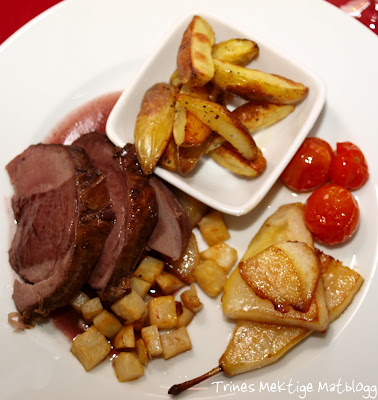 Reinsdyrstek, eller aller helt reinsdyrfilet, er mat jeg «må» ha i desember. Jeg fikk ikke skaffet reinsdyrfilet denne gangen og endte opp med en liten stek. Som tilbehør serverte jeg sprøstekt sellerirot, søte pærer og potetbåter – en utrolig god smakskombinasjon – sammen med ovnsstekte tomater og en nydelig portvinssaus. Prøv du også da vel, kanskje noe å forsøke i romjula? Til 4 trenger du omtrent: