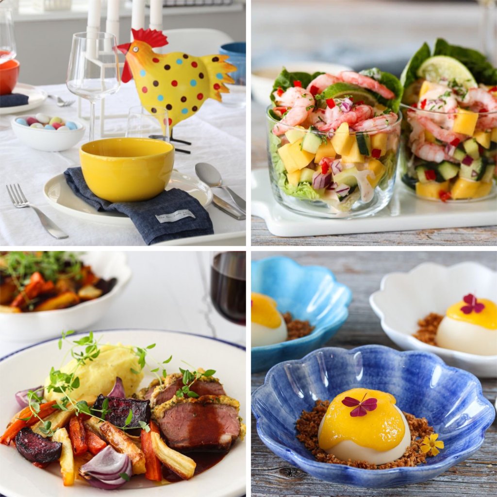 Inviter på en smakfull og fargerik treretters middag i påsken! På årets påskemeny står det rekecocktail med mango og chili, lammefilet med deilig tilbehør og panna cotta med kokos og mangosaus. Jeg håper det frister! Klikk på bildene for å komme til oppskriftene.