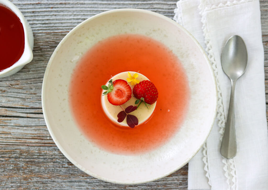 Jordbær- og rabarbragrøt med syltet rabarbra