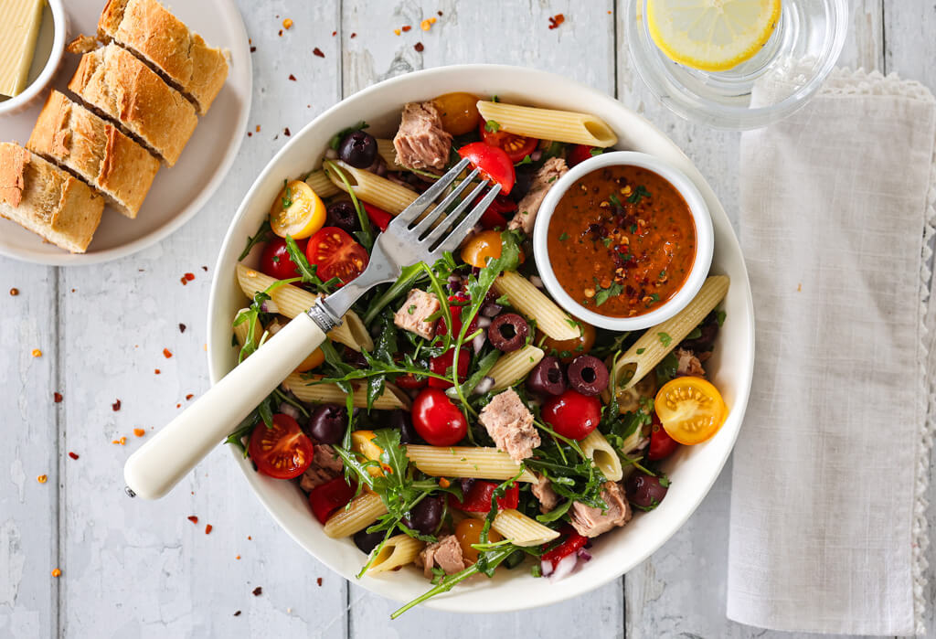 Pastasalat med tunfisk, tomat og paprikadressing
