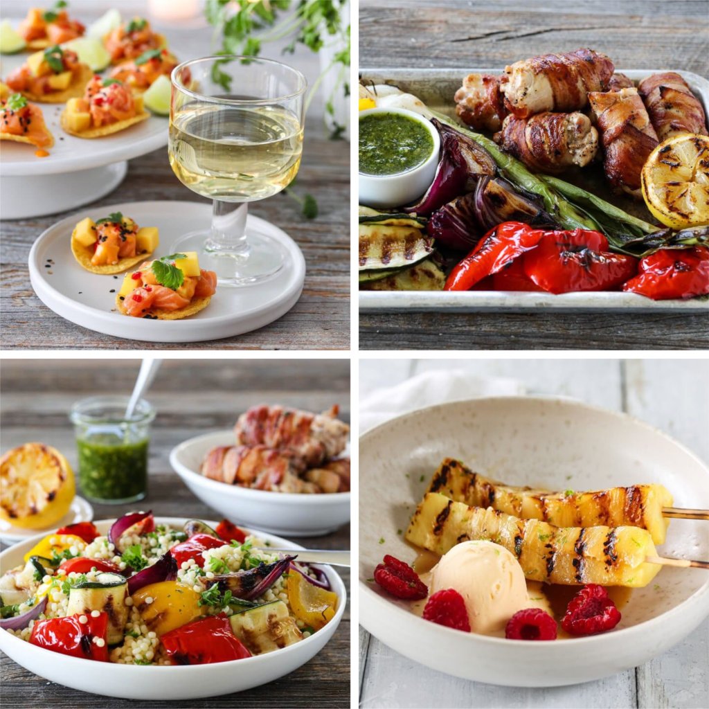 Inviter til sensommerfest med en smakfull og fargerik treretters grillmatmeny. På menyen står chilimarinert laks med mango, baconsurrede kyllinglår med smakfullt og fargerikt tilbehør – og grillet ananas med bringebær og vaniljeis til dessert. Klikk på bildene for å komme til oppskriftene.