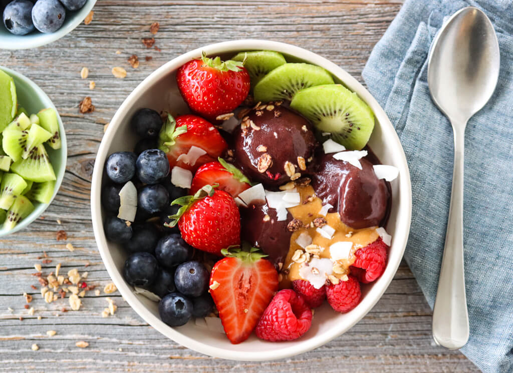 Ta Açai-bowl ut av fryseren ca. 15 minutter før du skal spise, slik at den tiner noe. Ha granola, frisk frukt og/eller bær i en liten bolle, og tilsett 2-3 kuler Açai-bowl. Topp det hele med kokosflak og mandelsmør, eller annet tilbehør etter smak og hva du har tilgjengelig.