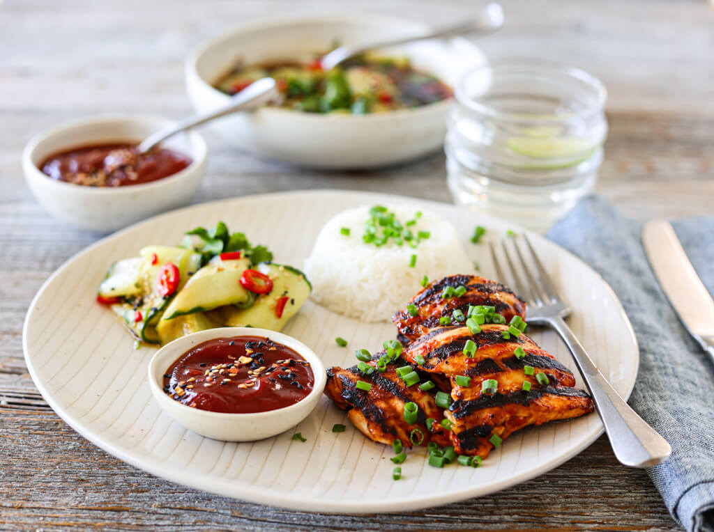 Saftig BBQ-kylling møter koreanske smaker i denne smakfulle retten der en søt, krydret tomatglaze gir kjøttet en deilig karamellisert overflate. Serveres med en frisk agurksalat, nykokt ris og resten av glazen som saus – perfekt balanse mellom sødme, syre og varme! En smakfull hverdags- eller helgerett du gjerne kan invitere gjester på!