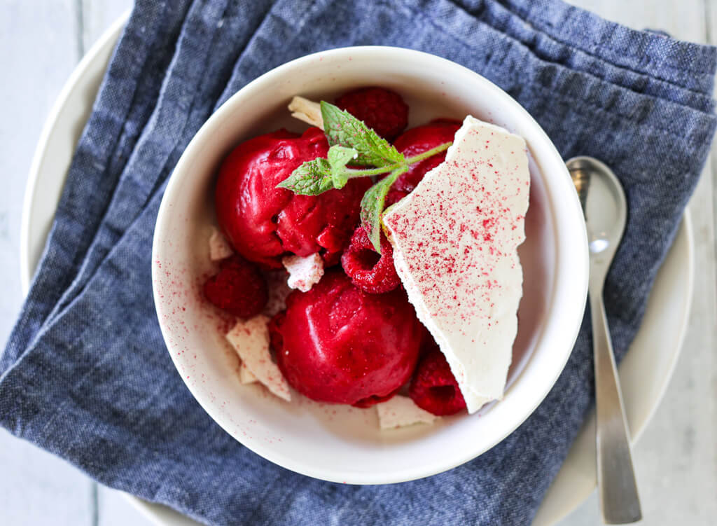 Når sommeren byr på søte, modne bringebær, er det få desserter som føles friskere og mer smakfullt enn en hjemmelaget knallrød bringebærsorbet. Denne sorbeten er både syrlig og søt, med en silkemyk konsistens som smelter på tungen. Toppet med sprø marengsplater og et dryss av frysetørket bringebær, blir desserten både lekker og smakfull. Litt frisk mynte på toppen setter prikken over i-en – både for øyet og ganen.
