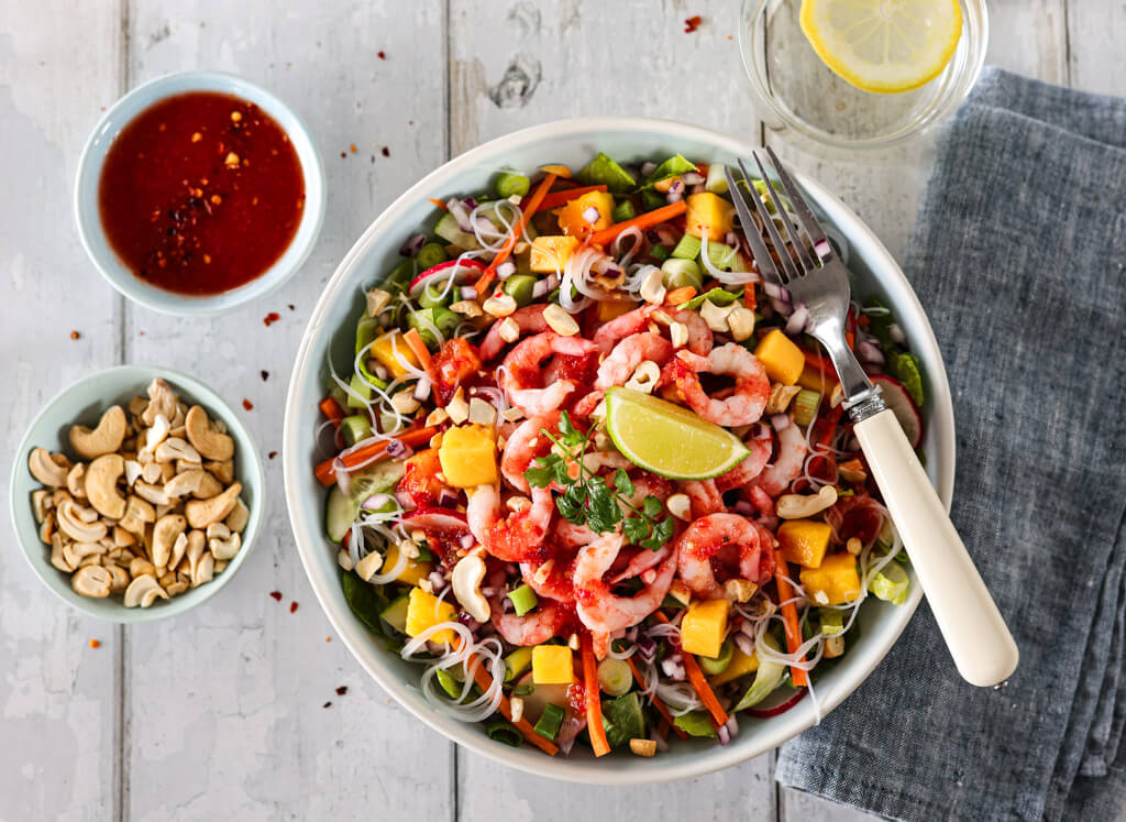 Lett, frisk og full av farger – denne asiatiske nudelsalaten med reker er en deilig kombo av søtt, syrlig og litt spicy. Her får du sprø hjertesalat, saftig mango, knasende gulrøtter og myke risnudler, alt toppet med en smaksrik og litt spicy tomatdressing. For best mulig smak og tekstur anbefaler jeg at du renser rekene selv, ferdigrensede reker på glass kan nemlig ikke måle seg med ferskheten og sødmen du får ved å gjøre jobben selv. Dette er en salat som både metter og imponerer!