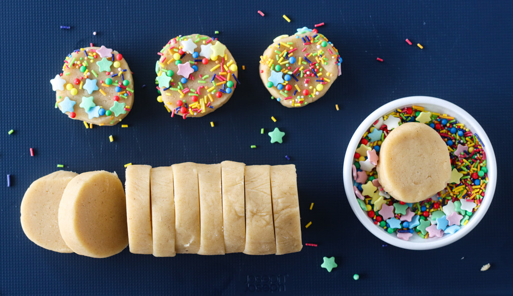 - Fjern plasten og legg deigpølsen på et skjærebrett. Skjær pølsen i cirka 18 like brede skiver og legg en skive oppi skålen med strøsselet. Press lett på skiven slik at strøsselet fester seg. Legg deigskiven med strøsselet opp på stekebrettet. Gjør det samme med resten av deigskivene.